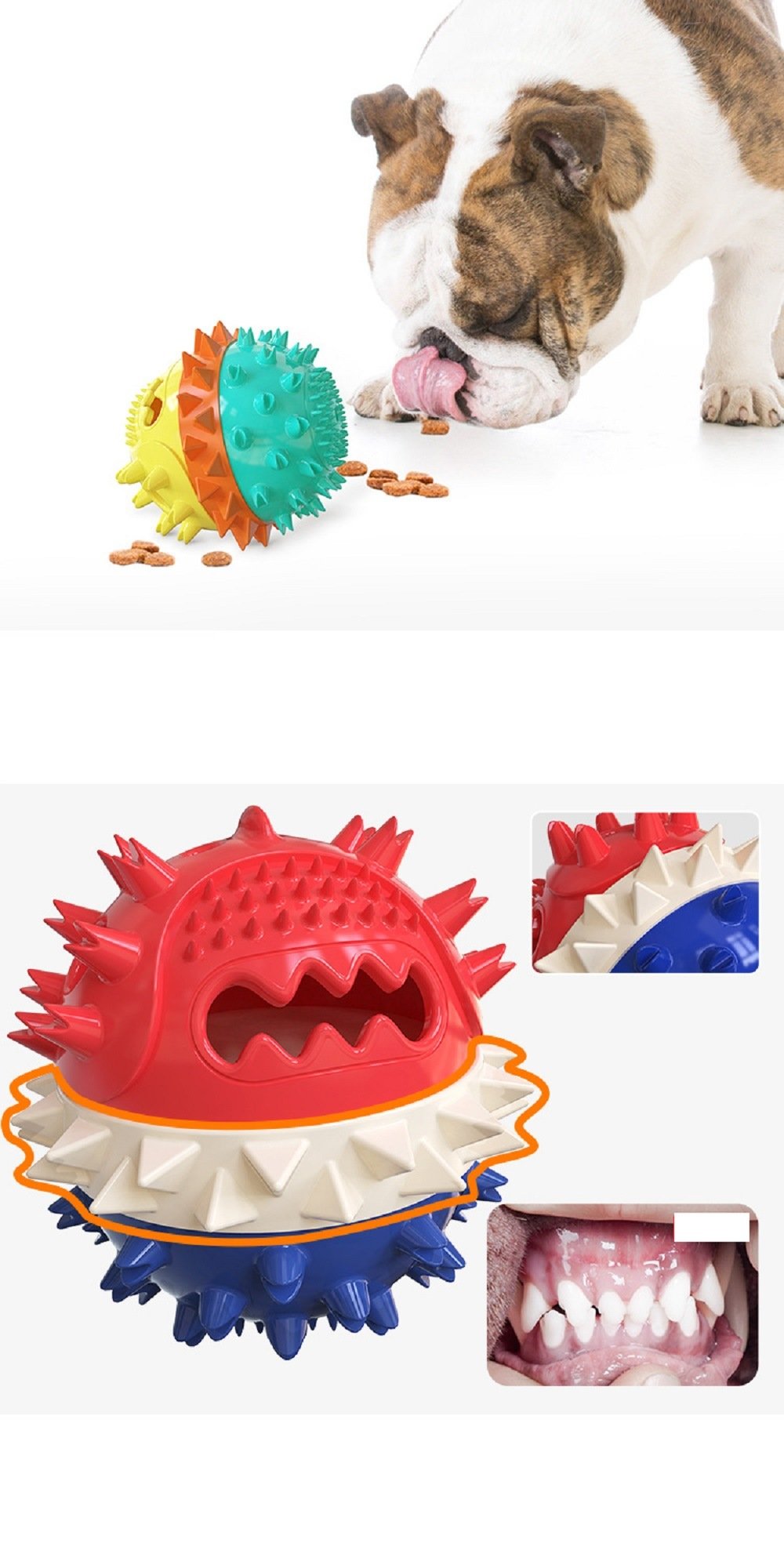 [Food Dispensing Pet Toy] Dog food, diced meat, snacks,etc, can be placed directly on the upper part of this product, in the process of fiddle, push, and play with the toy, the dog can get dog food or snacks through the leaking hole, this product allows the dog to obtain rewards through his own efforts. it not only increases the fun of the toy, but also improves the dog's IQ during playing.
